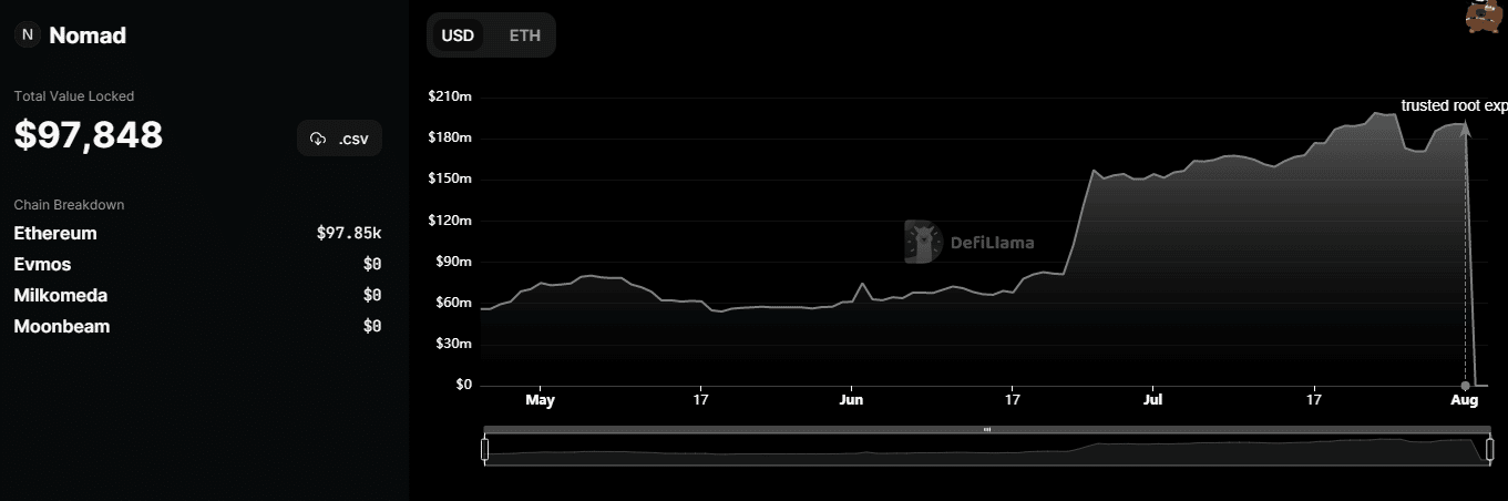 Graf vyššie zobrazuje zostatok na účte Nomad, ktorý bol takmer celý vykradnutý. Podľa DeFi Llama má k dňu 3. augusta projekt Nomad celkovú uzamknutú hodnotu (TVL) iba 97 848 dolárov.