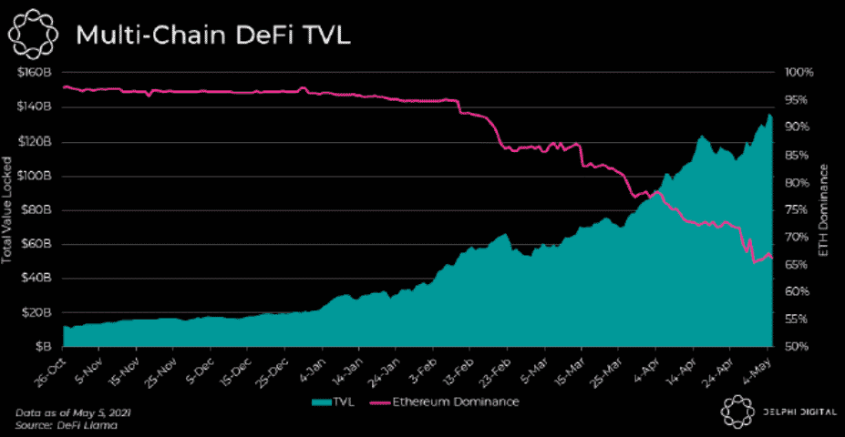 Podľa výskumu spoločnosti Delphi Digital, začali protokoly v najlepších ekosystémov vrátane Ethereum, BSC, Solana (SOL), Avalanche (AVAX), Polygon (MATIC) a Terra (LUNA) získavať trakciu a teraz tvoria 34% z celkovej hodnoty uzamknutej v decentralizovanom financovaní.