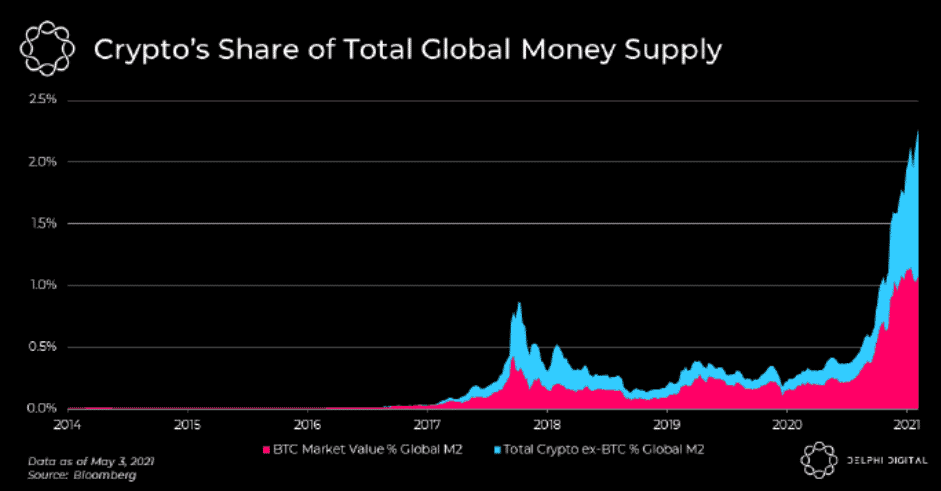 Vďaka ziskom uskutočneným v ekosystéme kryptomien od polovice roku 2020 predstavuje kumulatívny trhový strop kryptotrhu viac ako 2% globálnej ponuky peňazí M2. Iba na Bitcoiny (BTC) pripadá 1%. Zvyšok kryptotrhu predstavuje spolu asi 1,2% globálnej ponuky peňazí.