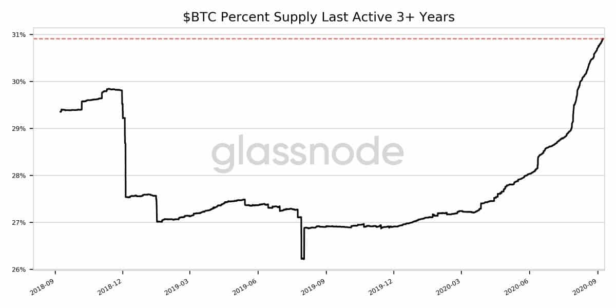 Veľká časť Bitcoinov dlhodobo sedí v tých istých peňaženkách. Takzvaný HODL index v roku 2020 neustále dosahuje nové historické maximá. 30,9% všetkých Bitcoinov v obehu v skutočnosti už tri roky neobieha. Nad 30-percentnou hranicou bol tento index naposledy v decembri 2018 krátko po pamätnom prepade na 3200 $.