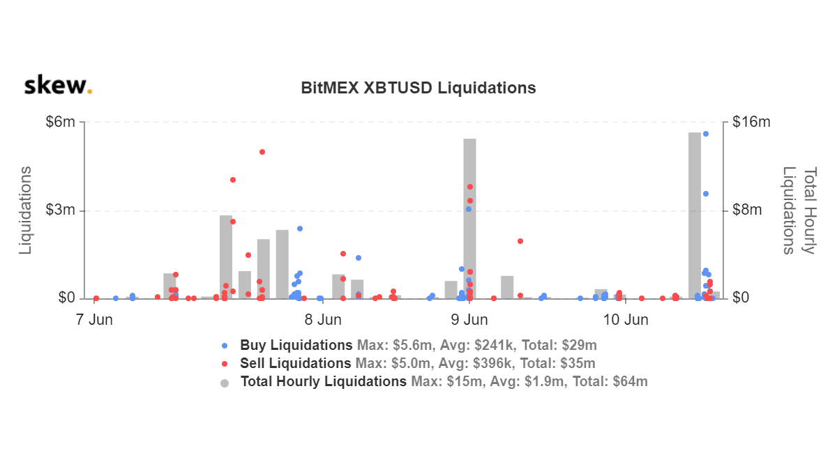 O tom, že interval 10 – 10 400 $ pôsobí ako silná rezistencia svedčí aj fakt, že vždy keď doň Bitcoin vkročí, burzy hlásia masívne vlny likvidácií shortov. Stalo sa tak aj naposledy. Podla dát z platformy skew.com boli iba na BitMEX-e zlikvidované short pozície v celkovej hodnote 14 miliónov dolárov. Stalo sa tak v priebehu 15 minút.