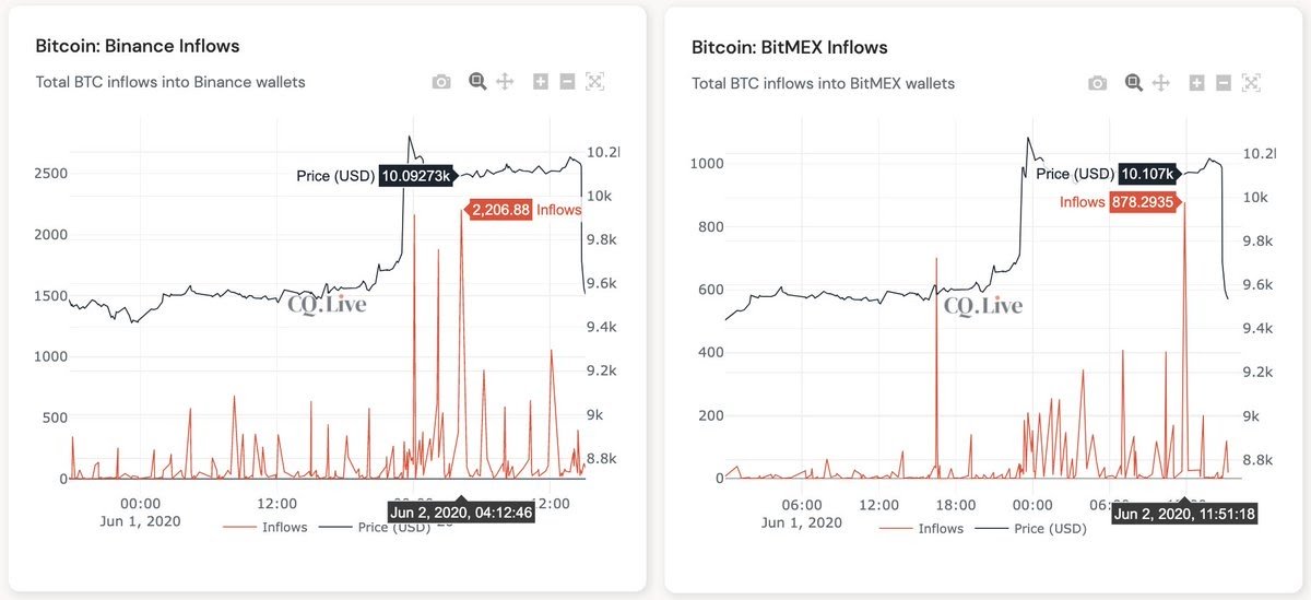Niekoľko hodín pred dnešným dumpom veľryby začali presúvať svoje peniaze zo súkromných peňaženiek na burzy Binance a BitMEX. Zaznamenali sme niekoľko veľkých transakcií ktoré naznačovali, že niečo bude diať.