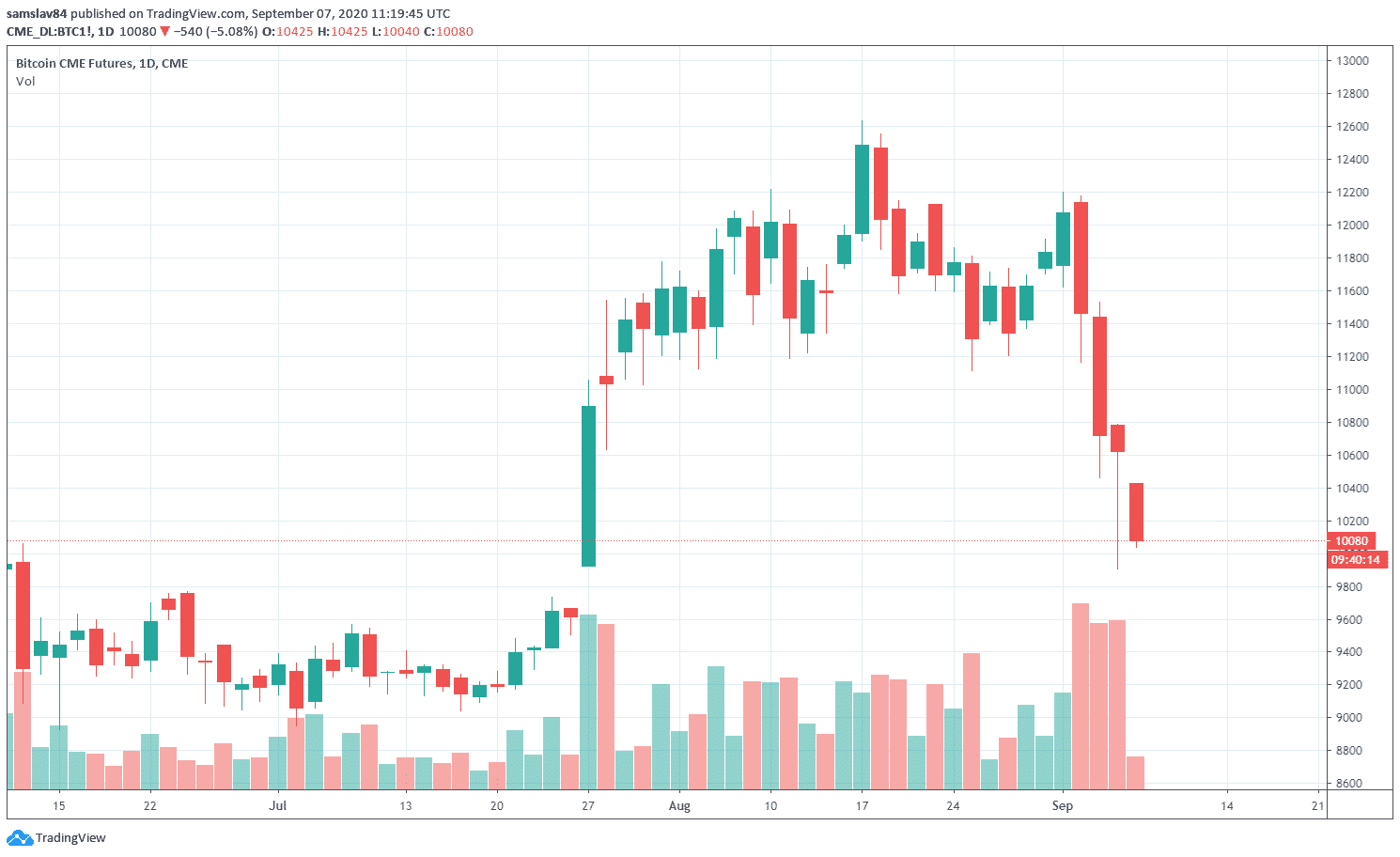 Trh s kryptomenami za uplynulý týždeň zaznamenal výrazný pokles. Bitcoin z prvo-septembrového high 12 050 $ klesol pod 10 000 $ a potvrdil tak bearish signály, ktoré trh vysielal v minulých týždňoch. Cena Bitcoinu aktuálne konsoliduje v pätciferných číslach, no mnohí traderi očakávajú ďalšie prepady. Minimálne na 9600-9700 dolárov, aby sa vyplnil CME GAP a otestoval kľúčový júlový support.