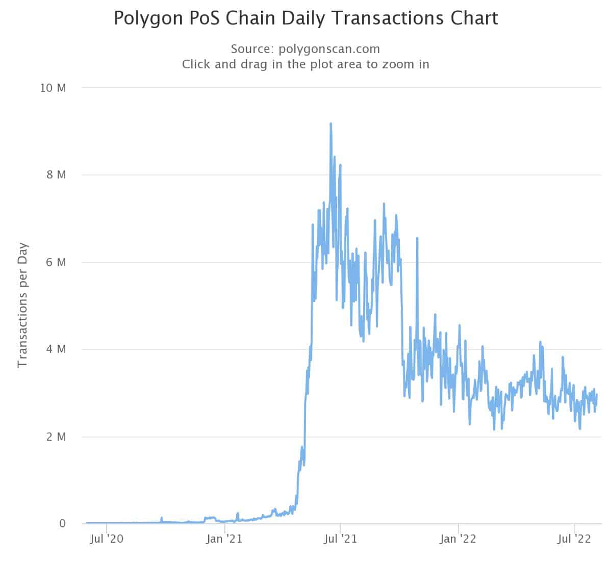 Počet transakcií v klesajúcom trende vytvára príležitosť na lacný nákup. Zdroj: polygonscan