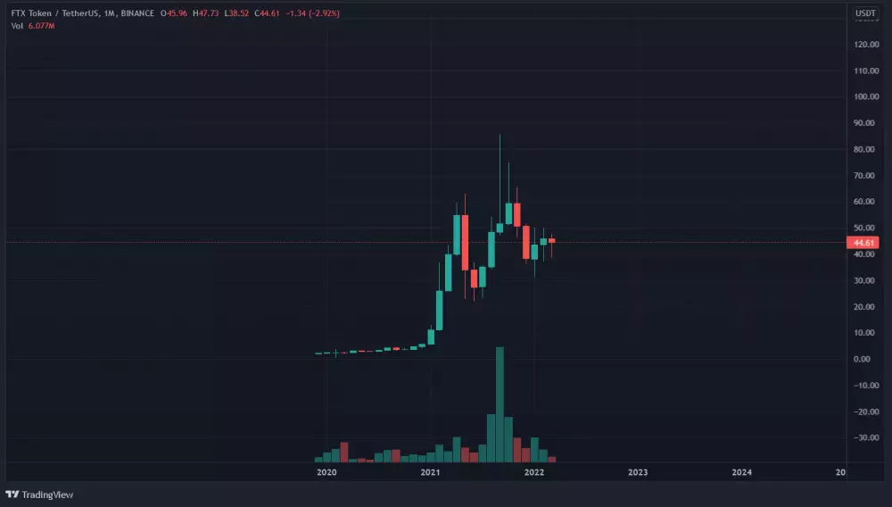 Hoci je token burzy FTX, FTT, aktuálne v korekcii, mesačný graf ukazuje stále vyššie low. Dlhodobo má token preto potenciál rásť. Zdroj: Tradingview