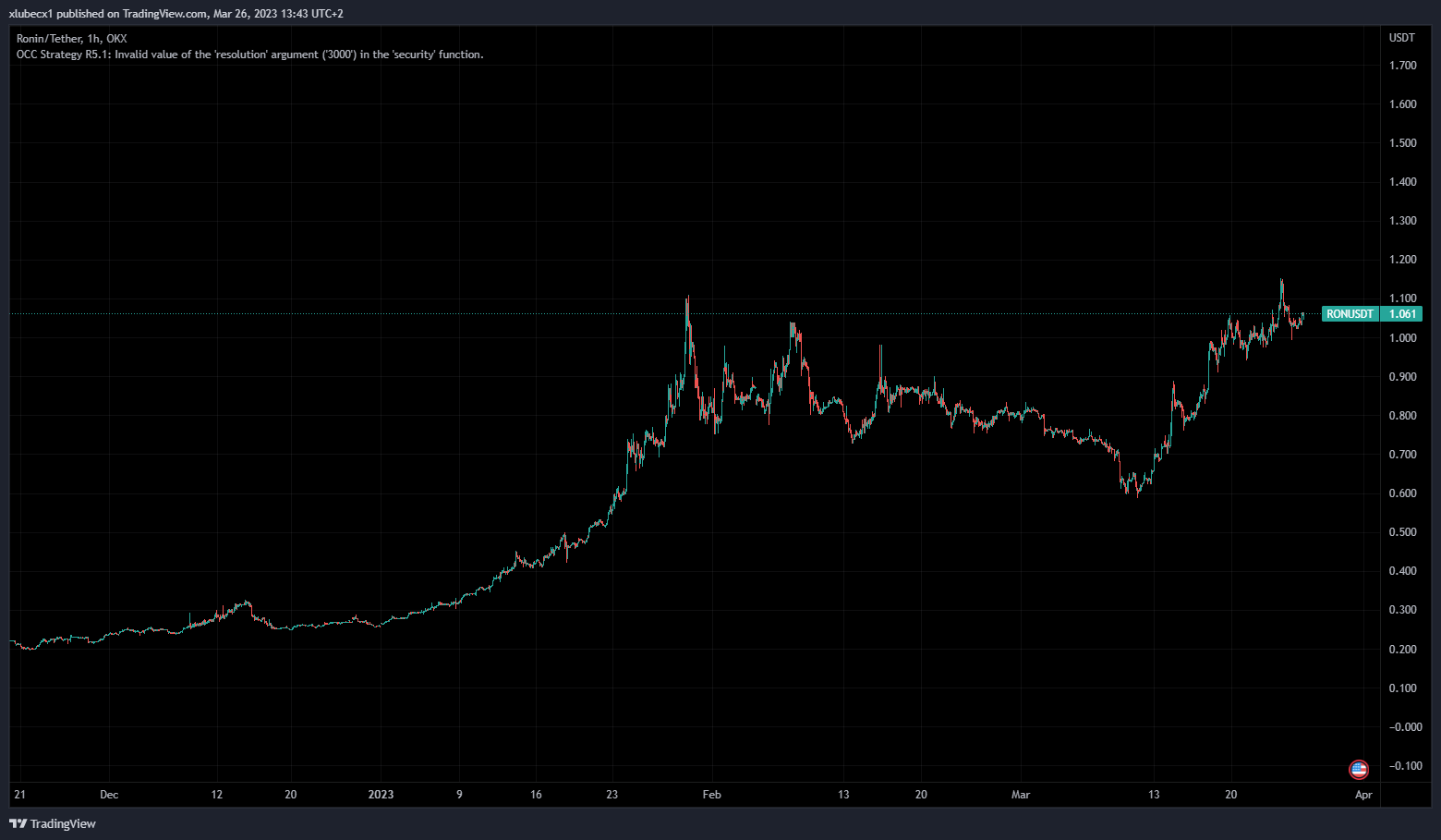 Ronin je spájaný najmä s jednou z najväčších krypto lúpeží na svete, kde zmizlo viac ako 620 miliónov dolárov. Prirodzene, cena na to reagovala a RON spadol až na svoje All time low – 0,196 $. Avšak, štyri mesiac po tom RON dosahuje nárast takmer 500 %.