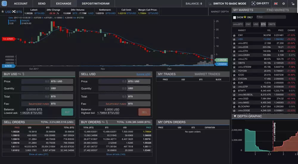 OpenLedger Dex založila rovnomenná Dánska spoločnosť zaoberajúca sa blockchain technológiou v snahe ponúknuť decentralizované riešenia pre trh s kryptomenami. Založenie účtu na tejto decentralizovanej burze je v naozaj rýchle a predovšetkým jednoduché, nakoľko nie sú požadované žiadne verifikácie, či KYC štandardy. Jediné, čo si musíte starostlivo uchovať, je vaše užívateľské meno a heslo. Burza aktuálne ponúka 63 obchodných párov a denný objem činí 81 tisíc USD (12.1BTC).