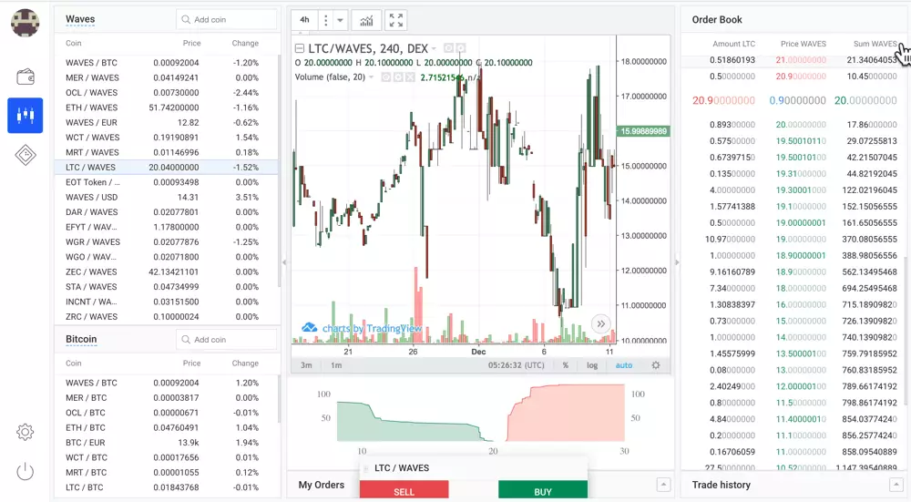 Ako už názov napovedá, táto decentralizovaná burza je dielom developerov kryptomeny Waves. Svojim klientom umožňuje obchodovať 64 obchodných párov. V čase písania článku sa denný volume pohybuje mierne nad 5 miliónov USD (793 BTC), čo je na decentralizovanú burzu slušné číslo. Najviac obchodovaným párom je WAVES/BTC a BCC/WAVES.