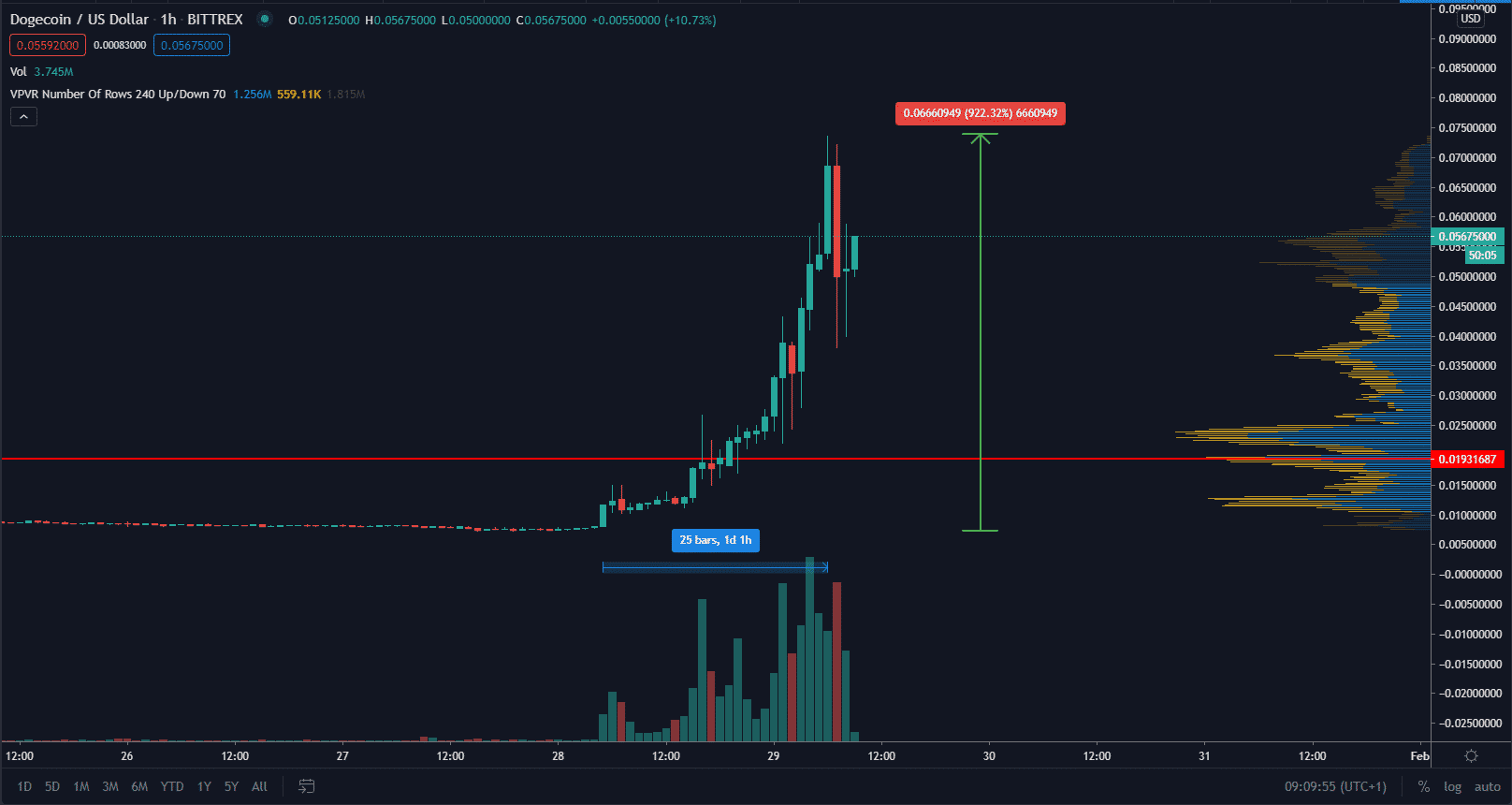 Okrem toho, že zaznamenal prudký nárast aktivity na Twitteri, zaznamenal Dogecoin podobný nárast objemu obchodov. Cena digitálnej meny sa dokonca zvýšila o viac ako 900% za jediný deň.