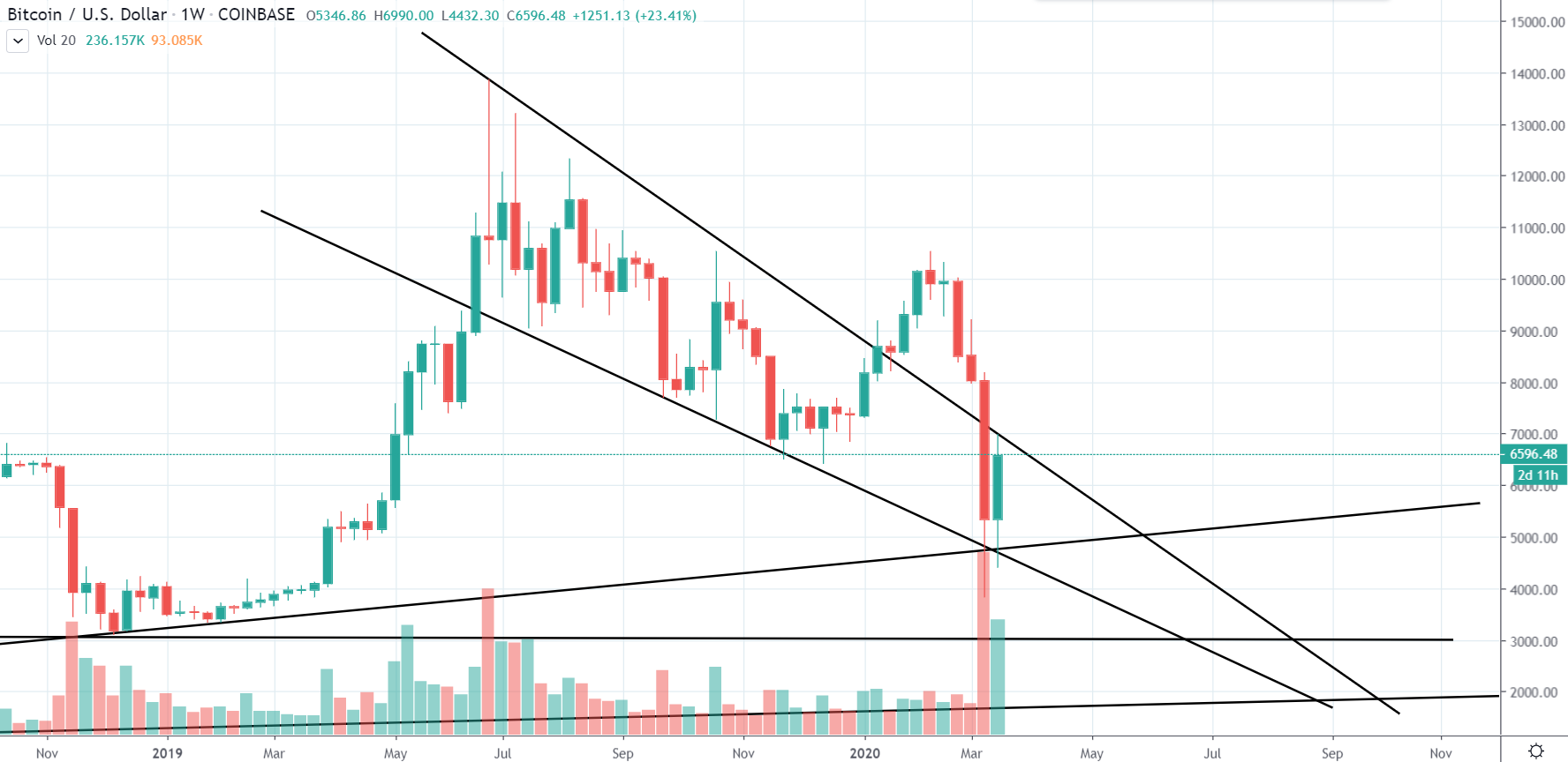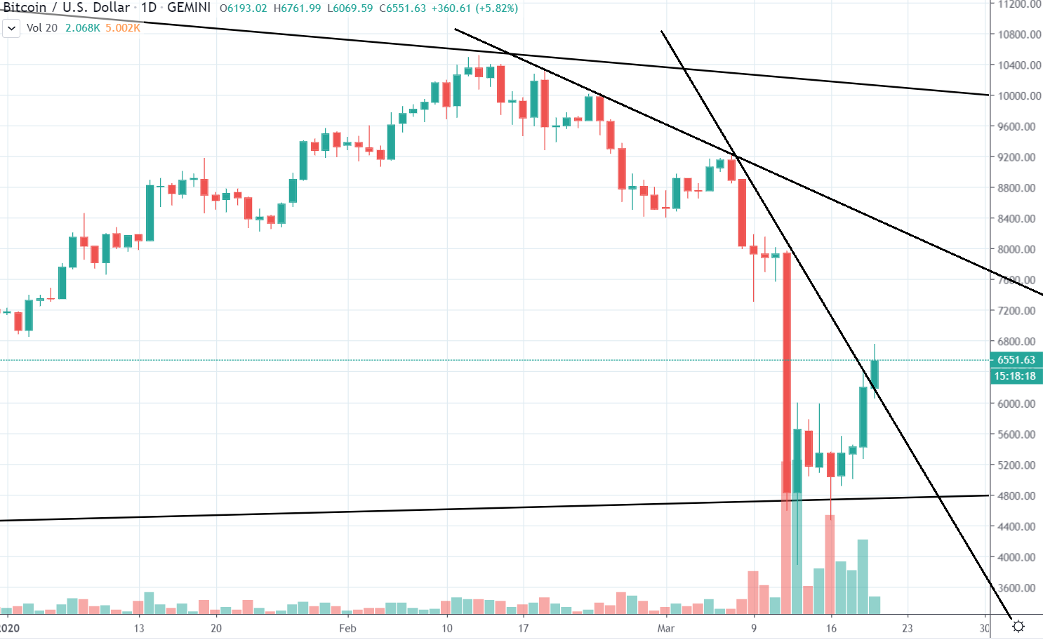[14:00] Bitcoin sa včera odrazil a predviedol celkom peknú pumpu, ktorá navyše ešte stále pokračuje, i keď v posledných dvoch hodinách cena klesla z 7000 $ na súčasných 6600$. Ak by sa náhodou stalo, že toto je high korekcie a budeme pokračovať v bear markete, Bitcoin sa pravdepodobne bude pohybovať vo formácii klesajúci klin (falling wedge).