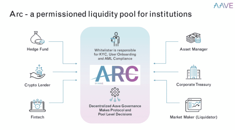 Na rozdiel od svojich krížových reťazcov bez povolenia na platforme, Aave Arc je povoleným fondom likvidity. Je špeciálne navrhnutý pre inštitúcie na udržanie súladu s predpismi v priestore decentralizovaných financií (DeFi).