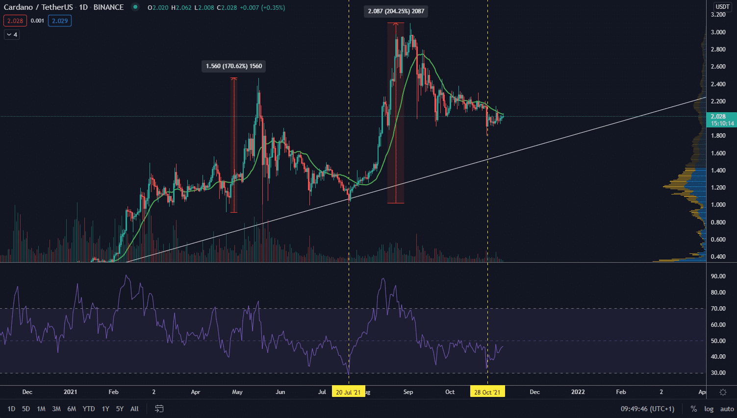 To však neznamená, že reverzia nastane okamžite a je dosť možné, že prejdeme ešte jedným korekčným legom pred skutočným býčím trendom. Hlavná supportná zostáva v rozpätí od 1,70 $ až 1,80 $. Toto je v súčasnosti najviac medvedí scenár, kam by sa cena mohla prepadnúť a následne pokračovať v býčom trende. Po uzatvorení konečnej štruktúry cena ADA pravdepodobne prekoná ATH.