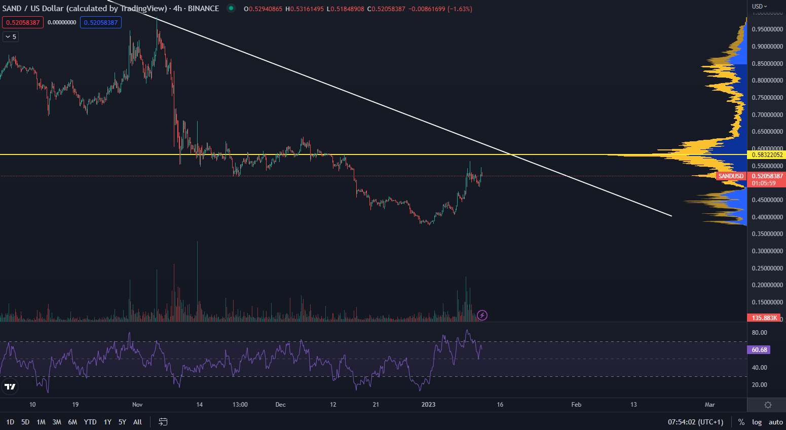 V čase písania článku sa podľa údajov z TradingView SAND obchoduje na cenovej úrovni 52 centov. Obchodné objemy stabilne rastú, no cena bude čeliť silnej rezistencii na zóne point of control 58 centov. Z krátkodobé hľadiska stále existuje priestor na dokončenie rastúceho trendu. SAND sa obchoduje na cenovej úrovni, na ktorej bol naposledy v júli 2021 a od historického maxima je vzdialený o 94 %.