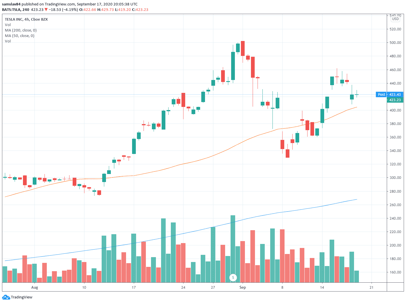 Akcie Tesly dnes uzavreli na 422 $, teda o 20 $ nižšie, než včera. Na grafe sa však objavil gap a dnešná svieca je tak zelenej farby. Najväčší rast Tesla zaznamenala 14. septembra, keď z 380 $ vyskočila na 420 $ a prekonala tak kľúčovú štyristodolárovú hladinu.