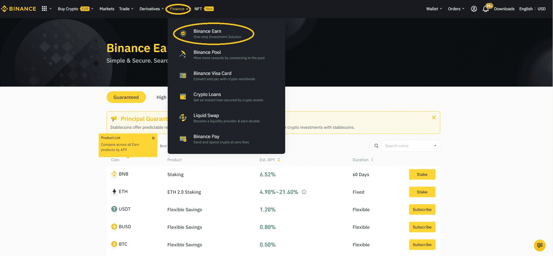 Druhý krok je, samozrejme, overiť si účet a dôkladne zabezpečiť cez 2FA a ďalšie bezpečnostné prvky, ktoré Binance ponúka. Čím viac, o to lepšie. Následne v ľavom menu nájdeme sekciu Binance earn.