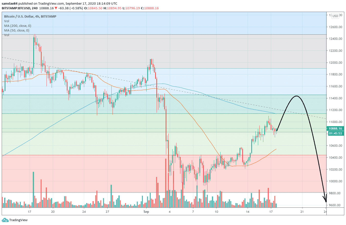 Tesne nad 11 400 $ sa nachádza hladina 0,618. Na hranici daily close z 1.9. – 11 900 $, sa nachádza 0,786 fibo hladina, ktorá je druhým kandidátom na vrchol súčasného rastu. Neočakávame, že by sa Bitcoin dostal o moc vyššie, keďže v ceste mu bude stáť silná rezistencia na okrúhlych 12 000 $.