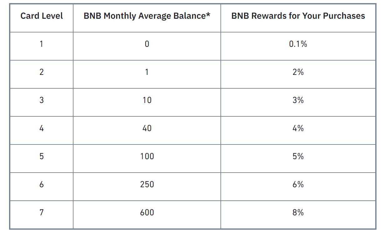 Hodnota cashbacku závisí od počtu držaných tokenov BNB na burze Binance. Cashback vieme získať aj v prípade, ak žiadne BNB nemáme na účte, ale iba vo výške 0,1 %. Zaujímavá odmena v podobe 2 % za každý nákup začína byť zaujímavá, ak vlastníme na burze aspoň 1 BNB, ktorý má aktuálne hodnotu 300 dolárov. Podľa potreby môžeme kúpiť z danej kryptomeny aj viac mincí a získame ešte vyšší cashback, ako môžete vidieť v tabuľke nižšie.