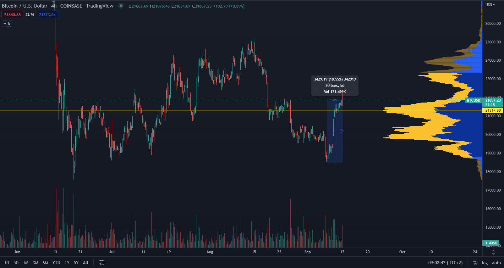 Cena hlavnej kryptomeny sa v čase písania článku obchoduje na úrovni 21 857 dolárov. Rastúci trend dosiahol len za 5 dní zhodnotenie 18,55 %. Aj keď sa objemy navýšili a aktivita veľkých investorov tiež, stále je priskoro tvrdiť, že Bitcoin dosiahol konečné dno.