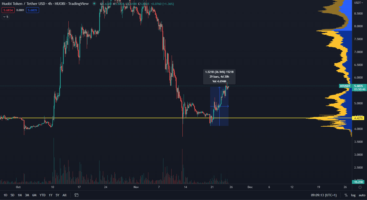 Dňa 20. novembra sa HT obchodovalo na cenovej úrovni 4,12 dolára, ale odvtedy narástol na súčasných 5,68 dolára. Nárast ceny je priamo spojený s oznámeniami Justina Suna a burzy Huobi Global. Huobi má v pláne totiž expandovať, pričom Huobi Global spustila obnovenú stratégiu budovania značky.