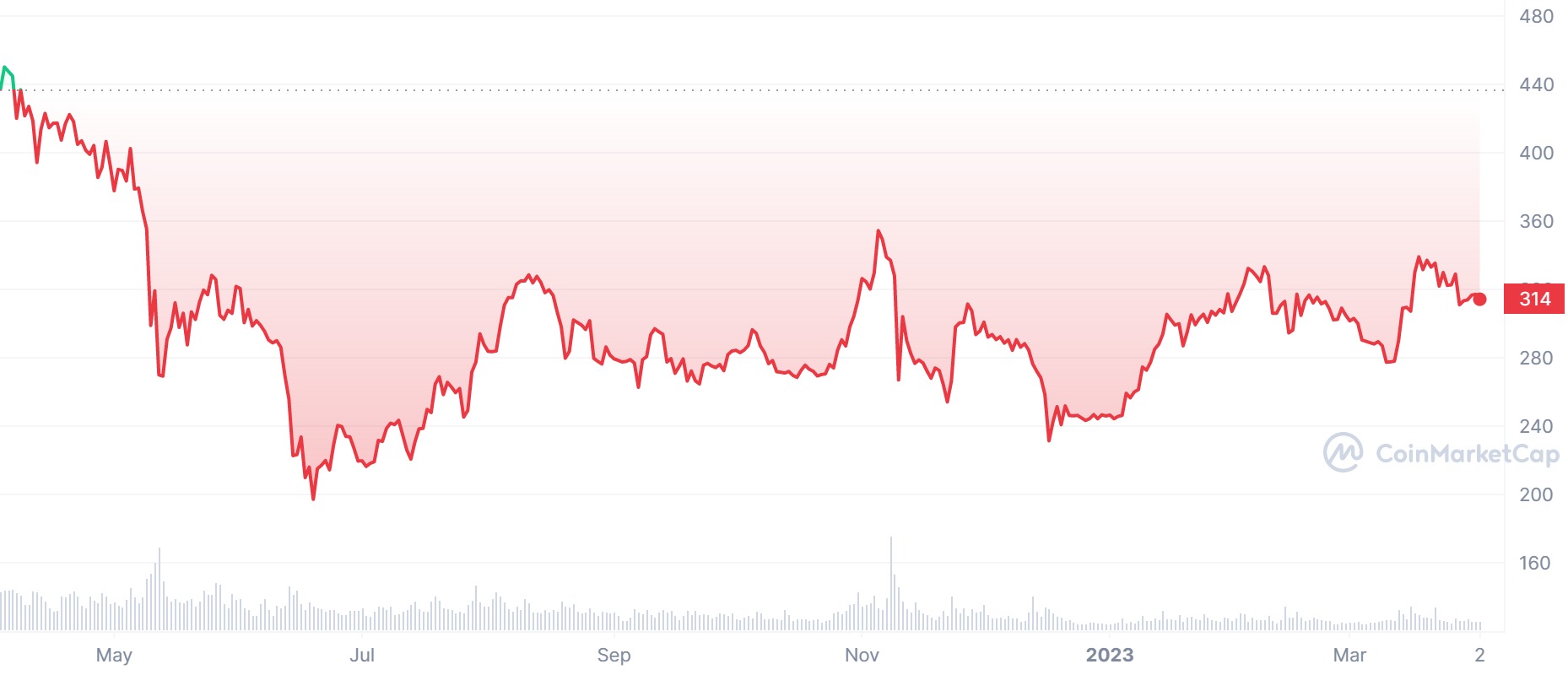 Cena sa aktuálne pohybuje na 314 dolárov. Posledné dno sa vytvorilo ešte počas minulého leta a to na 200 dolároch. Odvtedy Binance coin narástol iba o 50 % a nestíha s trhom. Napríklad, Bitcoin od pádu FTX vyrástol už o takmer 100 %. Záleží v súčasnosti primárne na burze, ako sa vysporiada s problémami, keďže cenový vývoj ich kryptomeny je na tieto udalosti úzko viazaný.