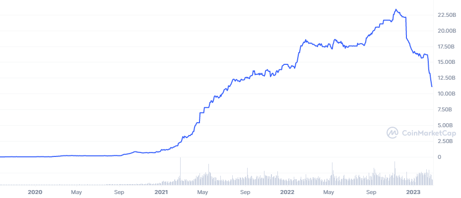 Z 23 miliárd sa marketcap za krátky čas prepadol už iba na 11 miliárd. Stablecoin môže už čoskoro vypadnúť z top 10 najznámejších kryptomien. A to ešte počas minulého roka mala burza Binance ambíciu sa stať lídrom v poskytovaní stablecoinov.