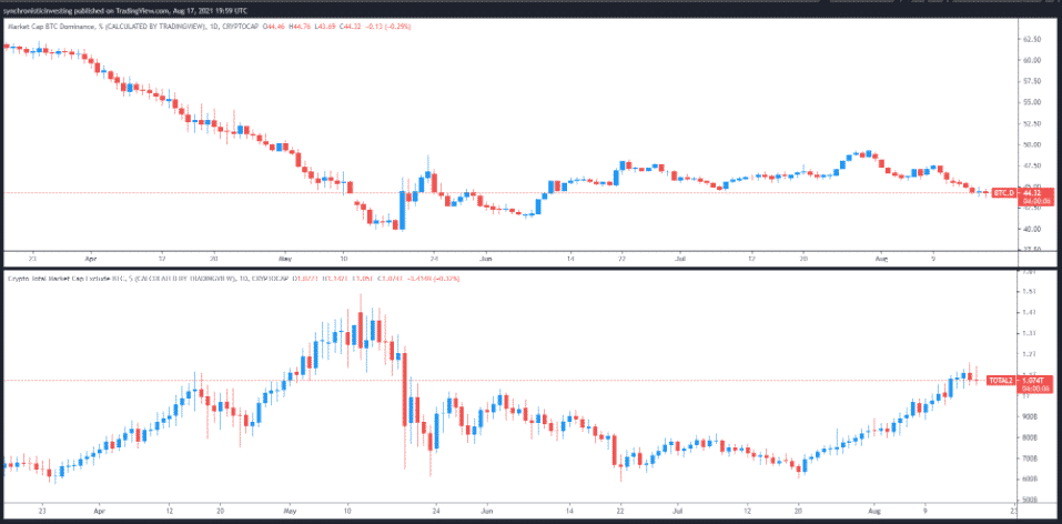 V súčasnosti sa rast BTC zastavil blízko cenovej hladiny 48 000 dolárov. Táto fáza bočného obchodovania dáva altcoinom príležitosť stúpať. Ako je znázornené na obrázku nižšie, celková trhová kapitalizácia trhu s altcoinmi sa od 20. júla zvýšila o 80 %. Medzitým miera dominancie Bitcoinu od 30. júla klesla o 10 %.