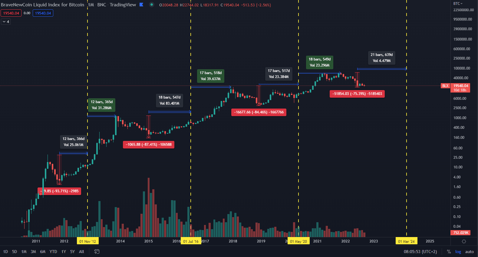 Na grafe vyššie môžeme vidieť dlhodobé cykly hlavnej kryptomeny, pričom korekcia dosahuje 75 % a je zatiaľ najmenšia spomedzi všetkých majoritných korekcií.