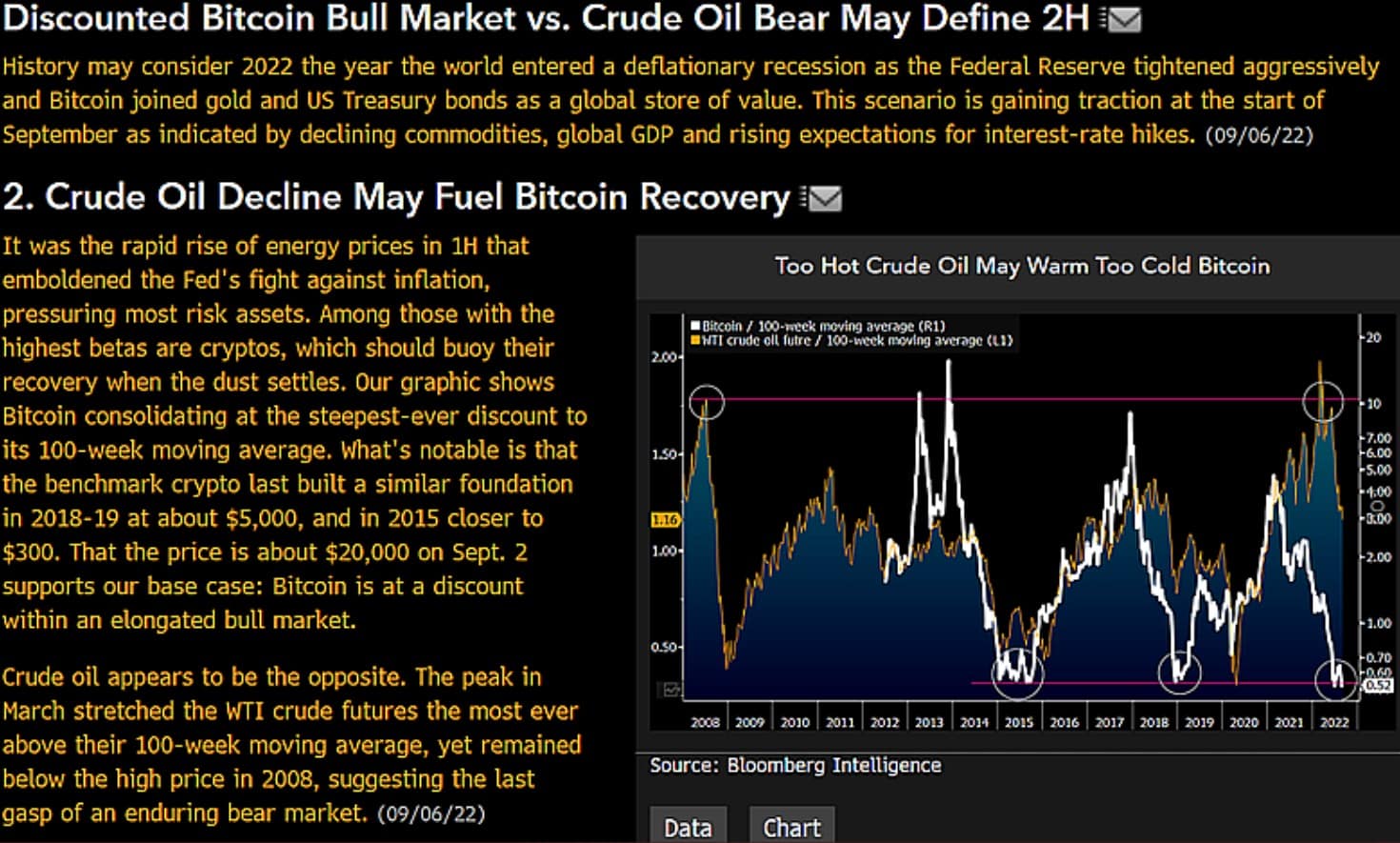 Okrem samotnej ceny Bitcoinu sa stratég vyjadril aj k cene ropy. Taký rýchly rast cien energií v roku 2022 vyústil do boja Fedu proti vysokej inflácii. Aktuálna situácia vytvára tlak na dopyt, ktorý prestáva uprednostňovať rizikové aktíva, a preto kryptomeny klesajú. Podľa stratéga sa však korekcia ustáli a vtedy nastane priestor na zvýšenie cien kryptomien.