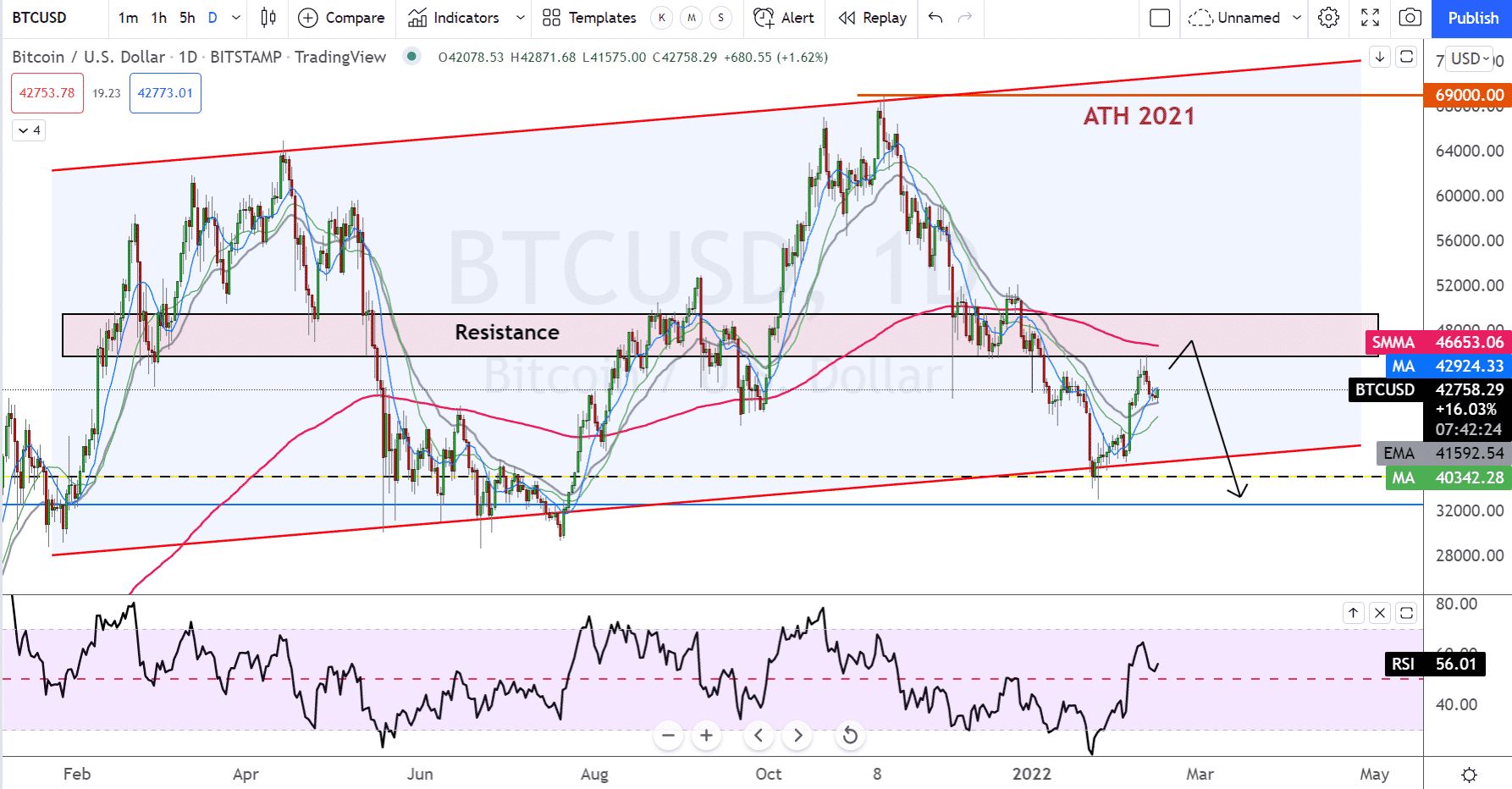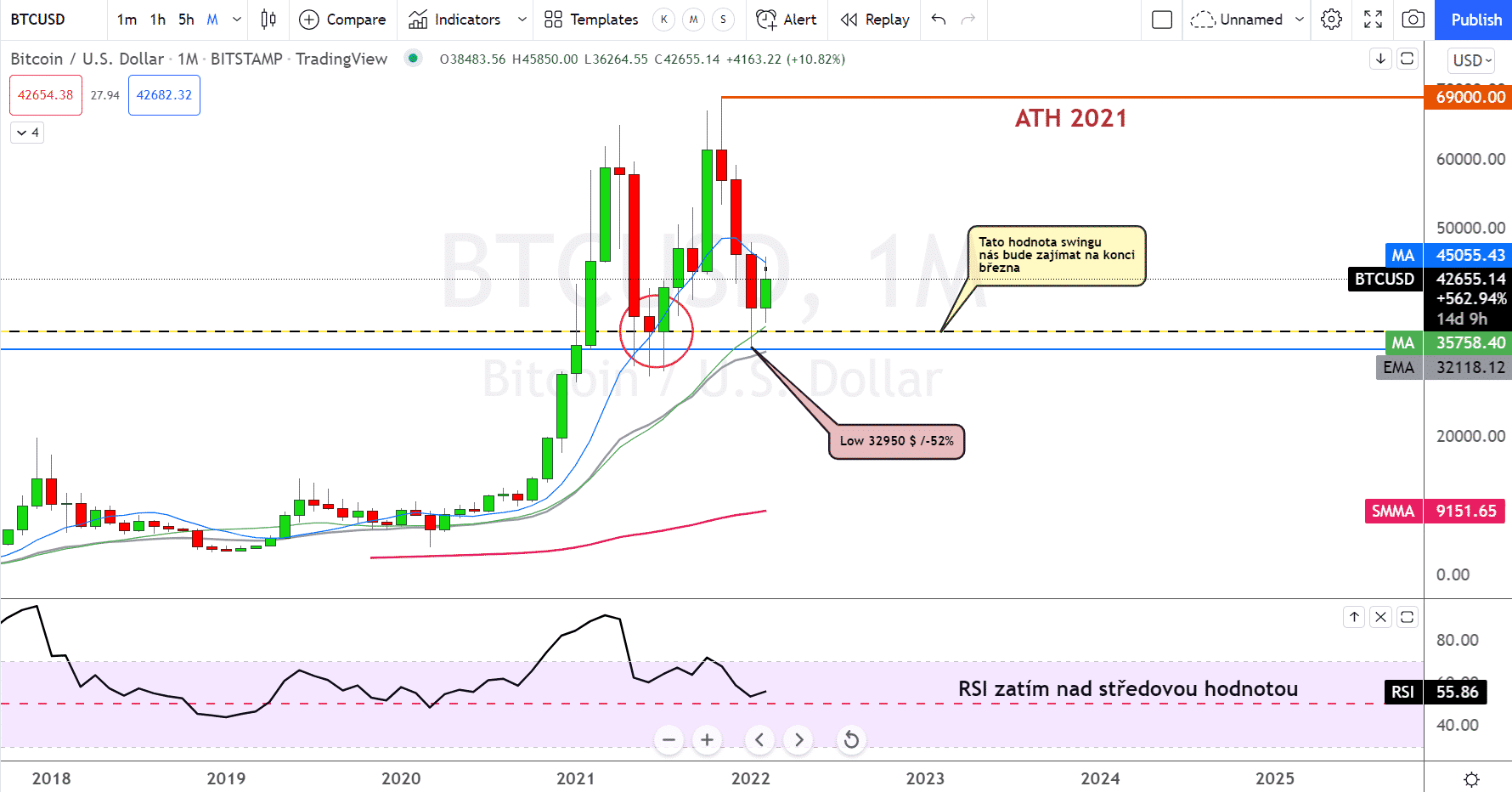 Bitcoin veľmi pravdepodobne neopustí dlhodobý UPtrend, aj keď globálna ekonomika nie je práve v dobrej kondícii. Do konca mesiaca sa dá očakávať opatrný rast, ale nehľadajte v tom obrat súčasnej korekcie. Koniec mesiaca by mohol byť celkom pozitívny práve okolo úrovní 44 000 – 44 500 $. Bohužiaľ sa jedná o rezistenciu podporenú mesačným swingom. A ak sa cena nedostane nad tieto hodnoty, bude sa jednať o zlyhanie na swingu. To bude, samozrejme, sprevádzané uzatváraním pozícií špekulatívneho kapitálu, ale tiež je to príležitosť otvoriť si tu menšiu short pozíciu a zarobiť na poklese. (Samozrejme, je potrebné počkať na close monthly sviece!)