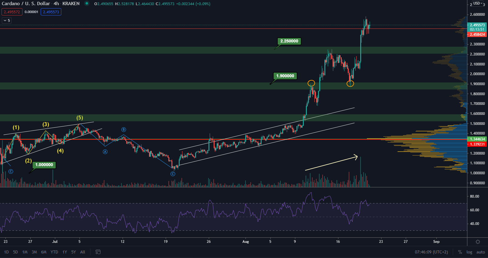 Cardano sa obchoduje blízko ATH a svojím posledným maximom mierne prekonal posledné ATH. Nastalo však zastavenie rastu a cena mierne stagnuje. Ak sa nachádzame na maxime a čaká nás mierna korekcia, tak support, ktorý budeme sledovať, je na hladine 2,25 $. Následne sa support nachádza na hladine 1,90 $. Na hladine 1,90 $ dokonca došlo k otestovaniu predošlého maxima z 11. augusta a išlo tak o býčí signál.