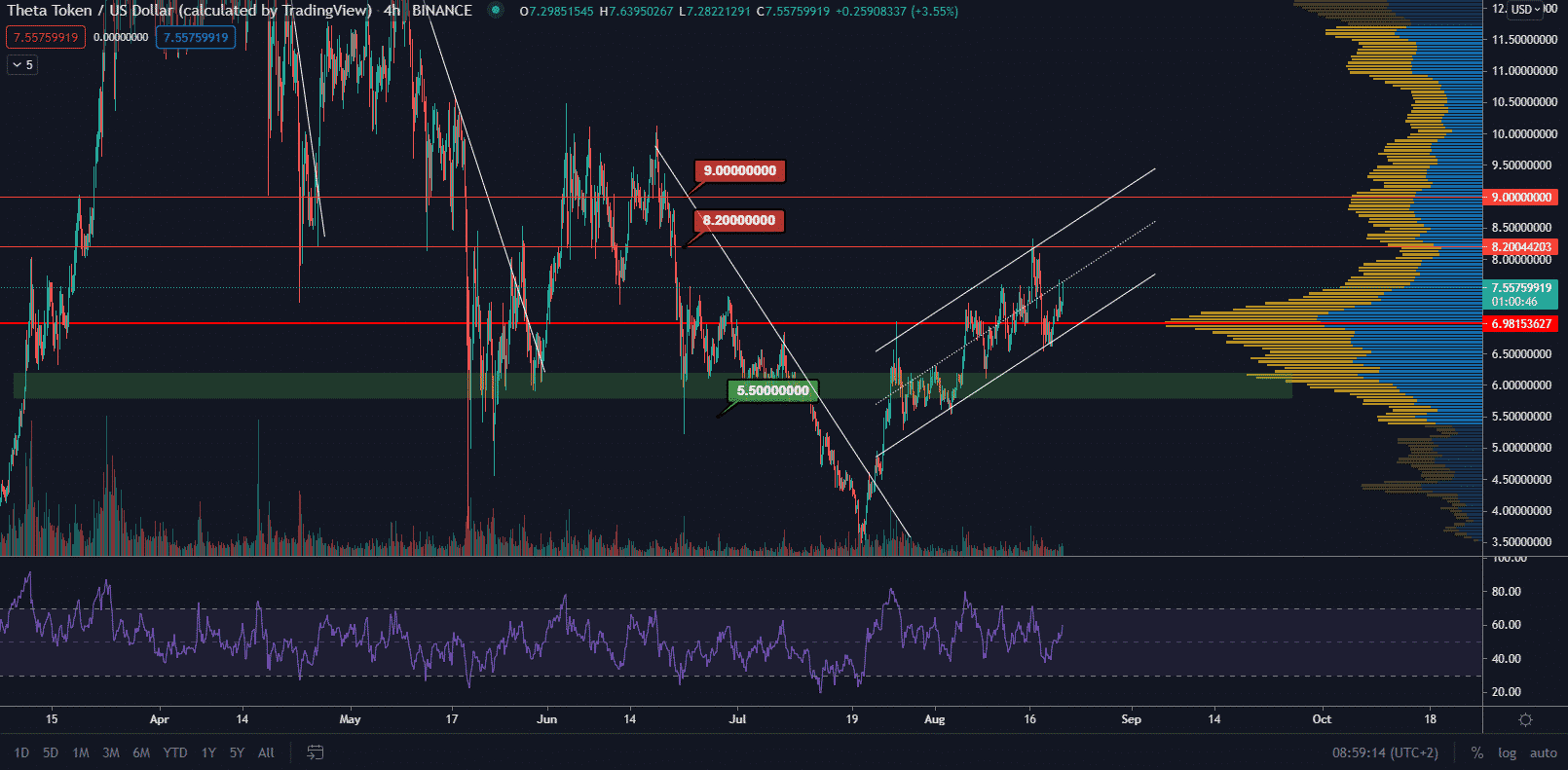 THETA na rozdiel od Cardana stále bojuje na hlavom supporte a aj keď sa nachádzame v rastúcom stabilnom medveďom flagu, tak retracement smerom nahor je stále slabý. Point of control predstavuje hlavnú akumulačnú cenu na hodnote 6,98 $. Najbližšie targety sú na hodnotách 8,20 $ a 9,00 $.