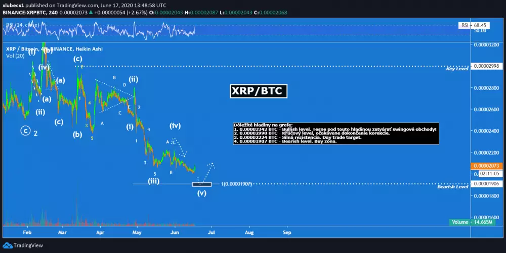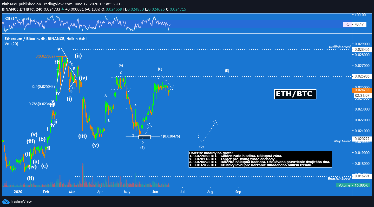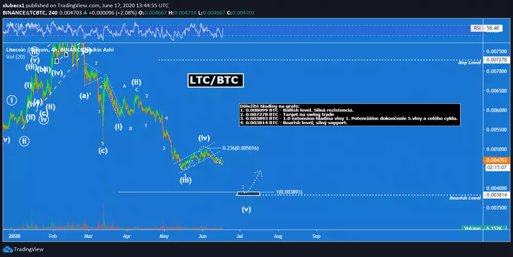 LTC samozrejme rovnako ide do finále. Podľa teórie Elliot wave môžeme očakávať posledný bearish pohyb, po ktorom by mala nasledovať sideways štruktúra. Na 1D time frame sa nám okrem toho tvorí bullish pattern falling wedge, ktorý by mal byť rovnako dokončený na úrovni okolo 0,0038 BTC.