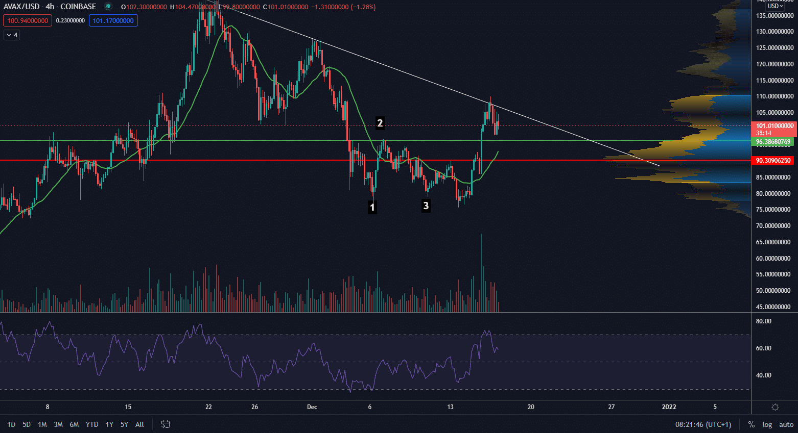 AVAX dosiahol lokálne maximum 110 $ a potvrdil tak rezistenciu z lokálnych maxím korekcie. Najbližší support sa nachádza na hladine 96 $, kde sa vyskytuje bod 2 a jeho otestovanie by znamenalo býčí signál. Navyše by na rovnakom mieste mohlo dôjsť k otestovaniu supportu MA21.