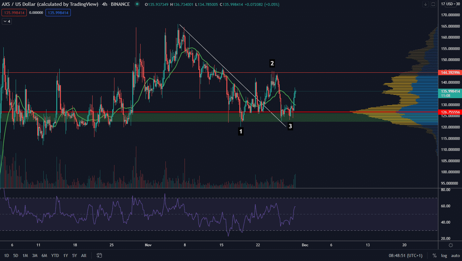 AXS sa rovnako ako mnoho altcoinov odrazil od supportu a vytvoril rastúci leg. Tento leg však nedokázal zatiaľ preraziť posledné maximum. Reverzia trendu tak nie je potvrdená, aj keď sa formuje potenciálny 123 bottom formation pattern. Navyše, posledné minimum sa vytvorilo na kľúčovom supporte, čím šance na ukončenie korekcie rastú.