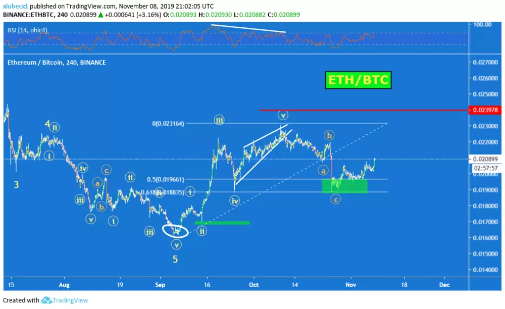 ETH/BTC má od začiatku celého cyklu ukážkový graf, aký sa len tak každý deň nevidí. Od septembra sa začala tvoriť lokálna bullish štruktúra, kde sa po breaku rezistencie na hodnote 0,018 BTC vytvorila 3. vlna, nasledovala korekcia a dokončenie celého cyklu. Koncom októbra sa začal tvoriť Rissing wedge a už vtedy sme mohli čakať začiatok korekcie, keďže Rissing wedge sa veľmi často tvorí v poslednej vlne. Vysoko pravdepodobný príchod korekcia nám potvrdila aj divergencia, ktorá by sa rovnako mala vytvoriť iba pri dokončení cyklu.