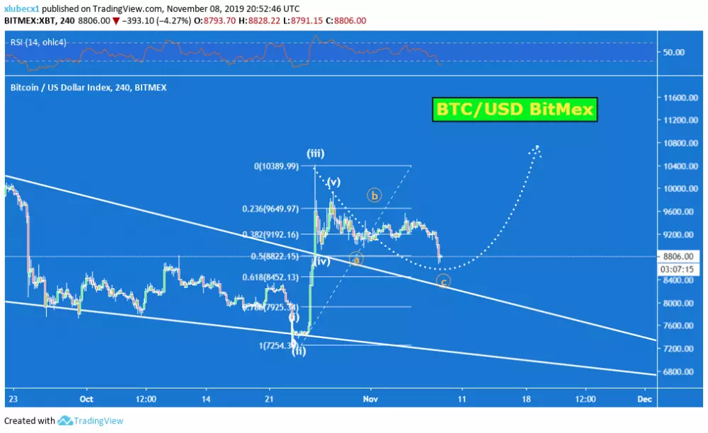 Zdravím všetkých traderov a čitateľov trading11.com a kryptomagazin.sk. Po dlhšej dobe tu máme obsiahlejšiu analýzu, kde sa pozrieme hneď na niektoré altcoiny. Úvodom sa však pozrieme na Bitcoin. Od včera pomaly klesá dole a dostáva sa do väčšieho retracementu. Počkal by som však na hodnotu 8 400 USD, kde je hodnota 0,618 % celého bullish cyklu a zároveň vrchná trend line falling wedgu.