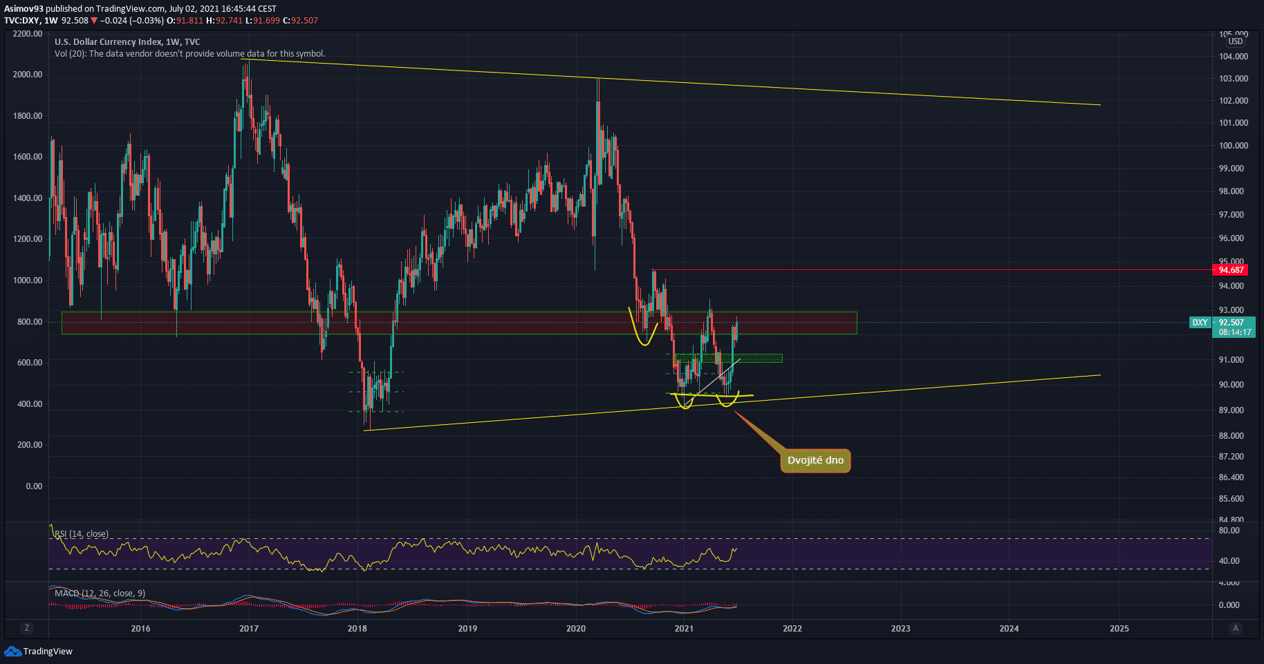 Pokiaľ sa teda jedná o techniky DXY, v grafe sa nám vytvára Dvojité dno, ktoré však nie je ešte potvrdené. Zmienené Dvojité dno bolo na zreteli už v apríli, kedy bolo zrejmé, že kurz smeruje k otestovaniu ročného low. Avšak dolárový index nemá ani náhodou vyhrané, pretože sa stále nachádza v rezistentnom pásme 92,5 bodov.