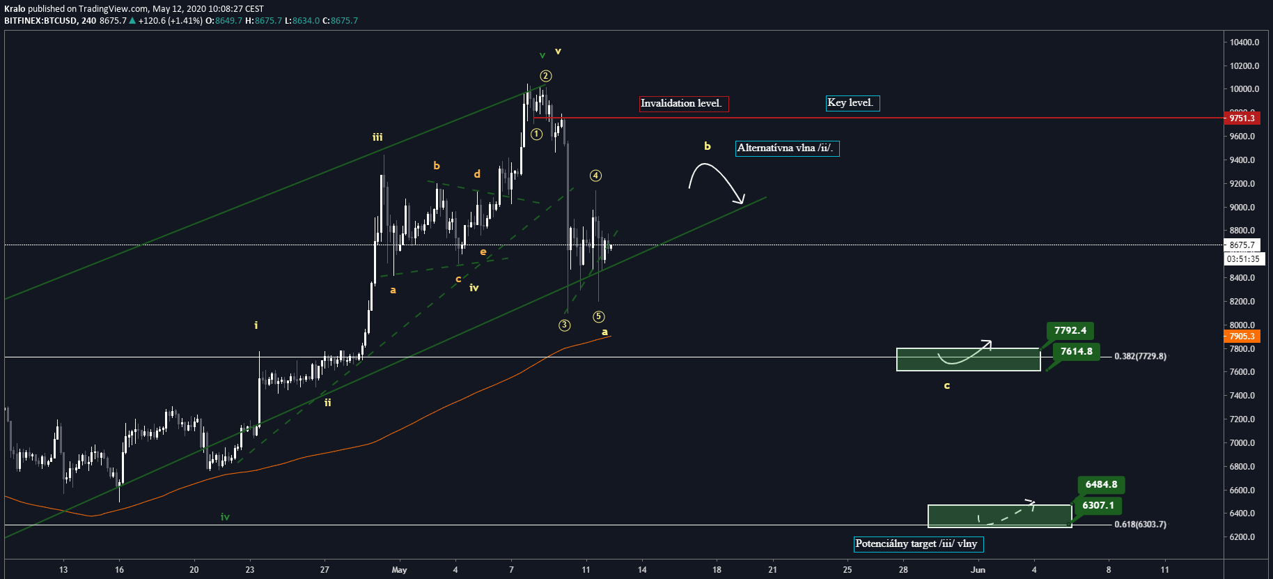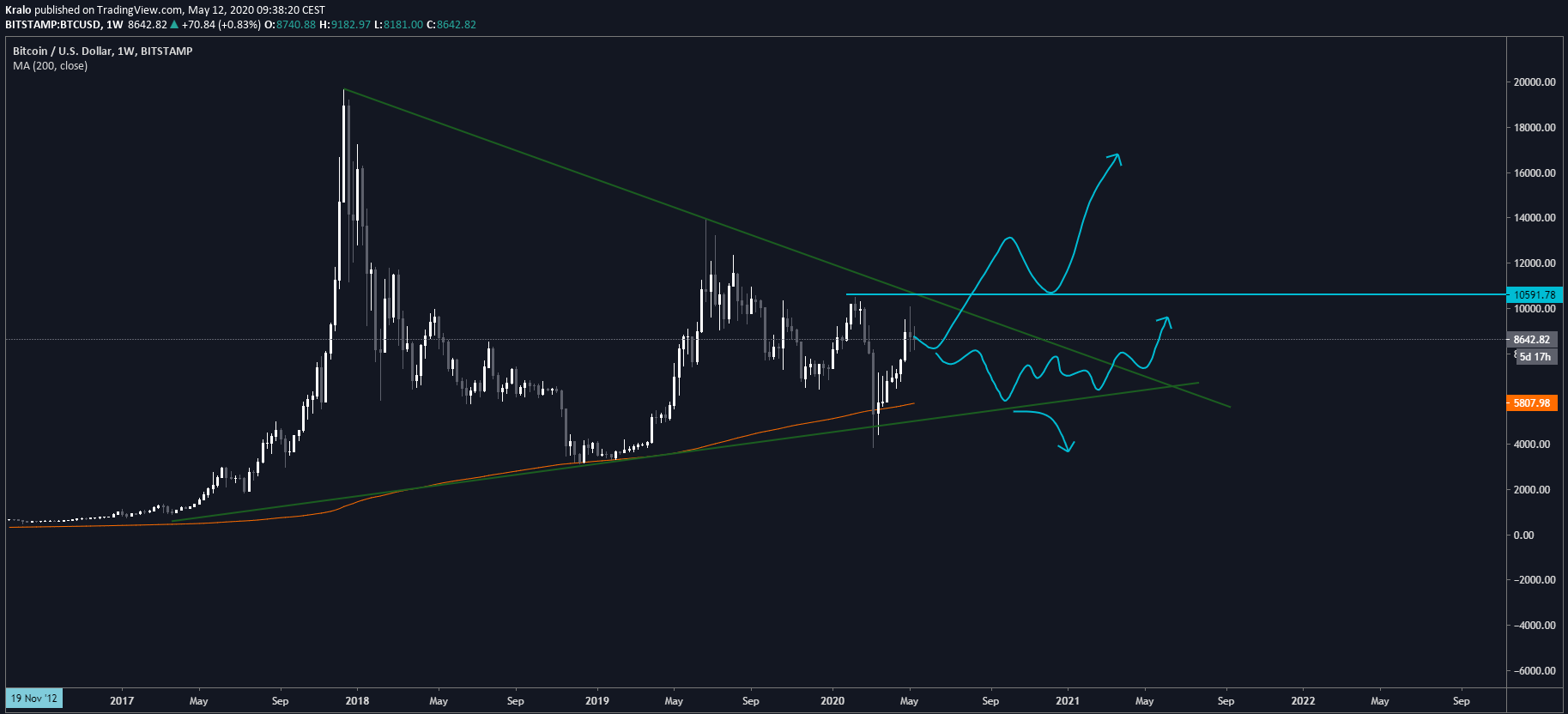 Halving je konečne za nami a cena je aktuálne na 8 600 USD. Ako hlavný scenár trackujem stále tento gigantický triangel. Aj keď sa to nezdá, tak aj v triangli máme hneď niekoľko možností. Na to, aby sme však mohli sebavedome povedať, že sa nachádzame v bull-rune, tak potrebujeme prekonať trendovú líniu a ideálne aj vytvoriť higher high.