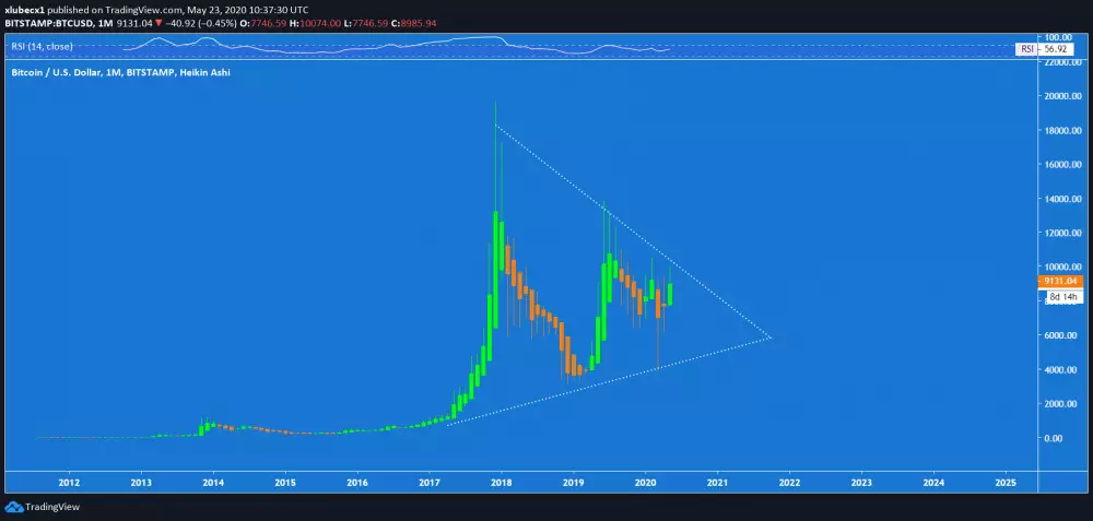 Na úvod dnešnej analýzy sa pozrieme na 1-mesačný graf. Na tomto grafe môžeme sledovať 2 kľúčové štruktúry, ktoré sa tvoria na BTC. Jednou z nich je veľký triangel, ktorý by mal byť počas nasledujúcich 2 rokov dokončený. Pokiaľ nepríde bullish break out, tak pravdepodobne do konca roka 2022 môžeme zabudnúť na ATH. Cena by sa mala dovtedy pohybovať na hodnotách okolo 10 000 dolárov.