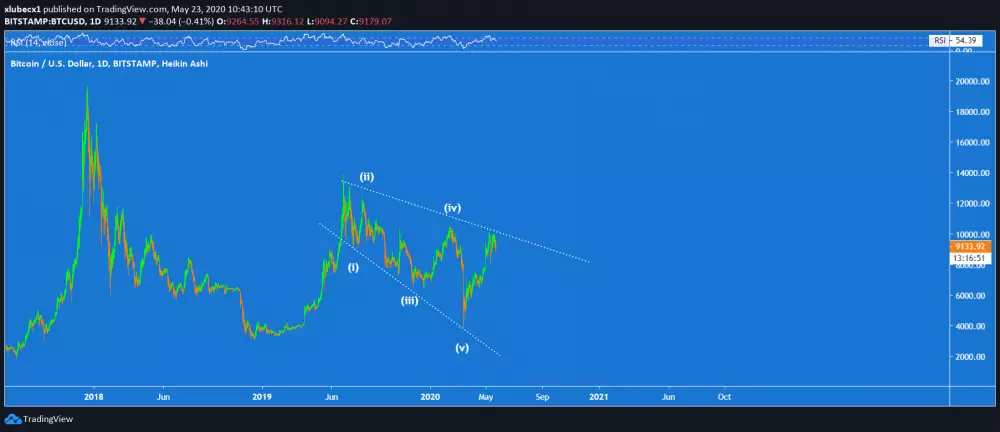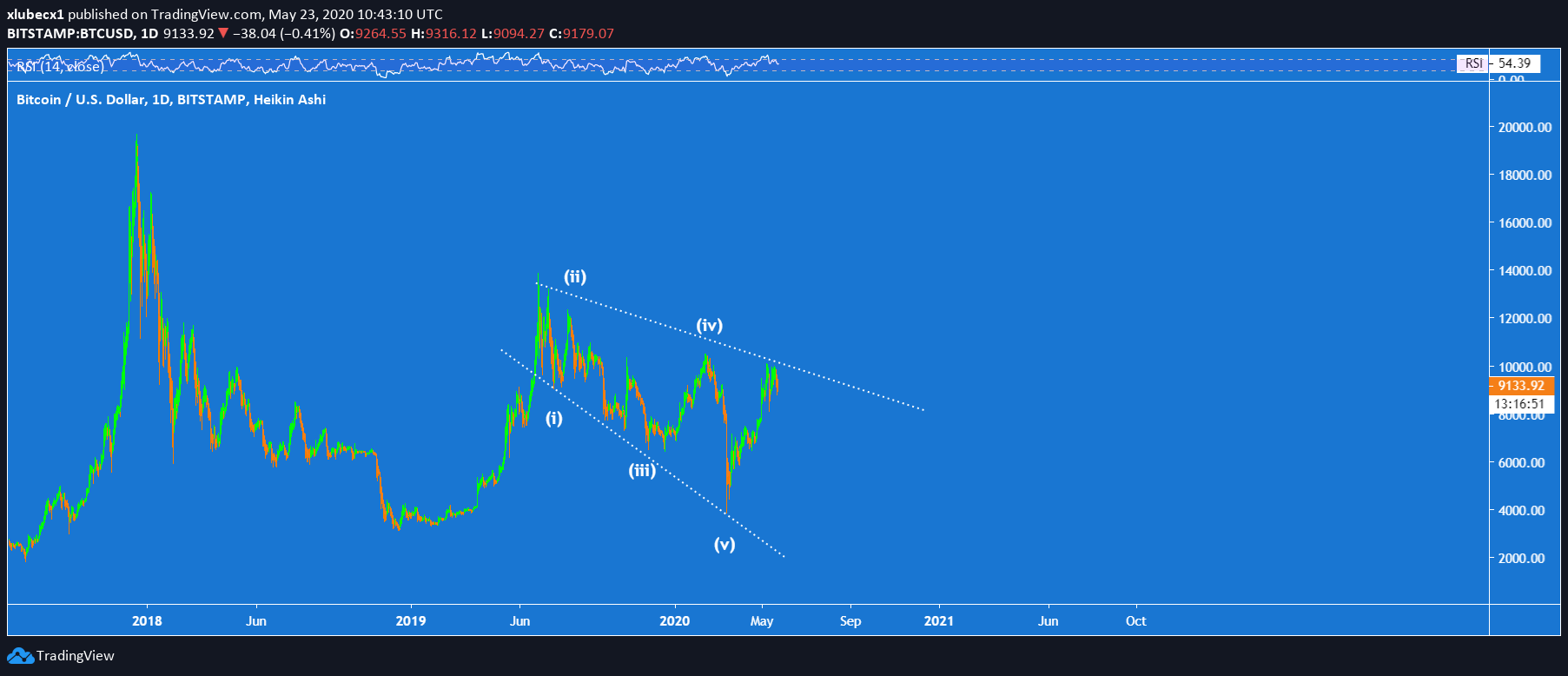Na 1D grafe sa nám tvorí štruktúra v tvare expanging wedge. Taktiež tu môžeme identifikovať štruktúru, respektíve trende line, ktorá drží BTC v krátkodobom bearish trende. Zdá sa, že wedge už bol dokončený a teraz môže pomerne s vysokou pravdepodobnosťou očakávať ďalší veľký rast. Najprv však musíme zlomiť práve silnú rezistentnú trend line.