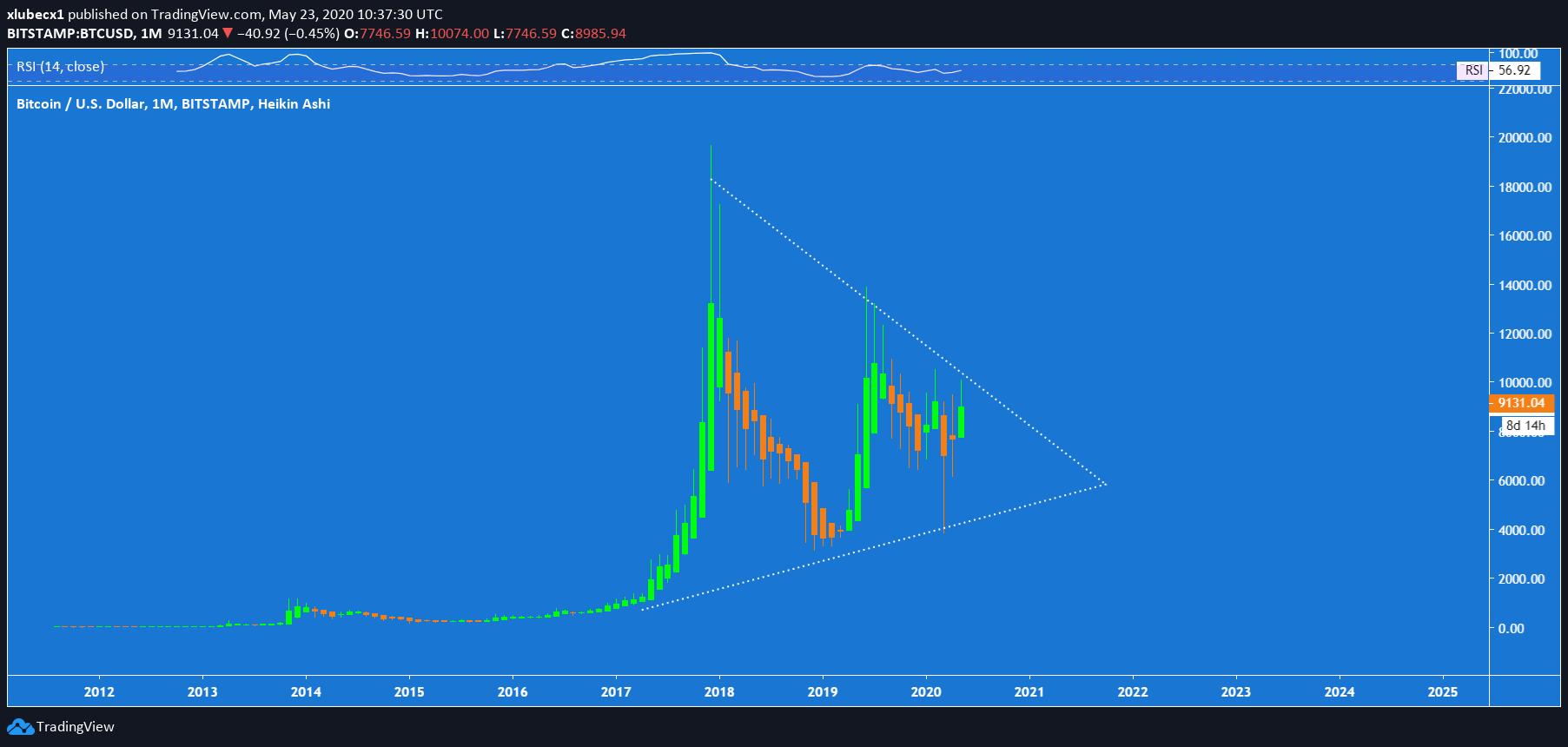 Ďalšia kľúčová štruktúra, ktorá sa tvorí na grafe je bearish trende line. Táto rezistentná čiara sa začala vytvárať ešte koncom roka 2017, kedy bol Bitcoin na svojom ATH. Od toho času sa Bitcoinu nepodarilo dostať nad túto kľúčovú trende line. Ak by však prišiel break out tejto rezistencie, dalo by nám to veľkú nádej na začiatok bullish cyklu.