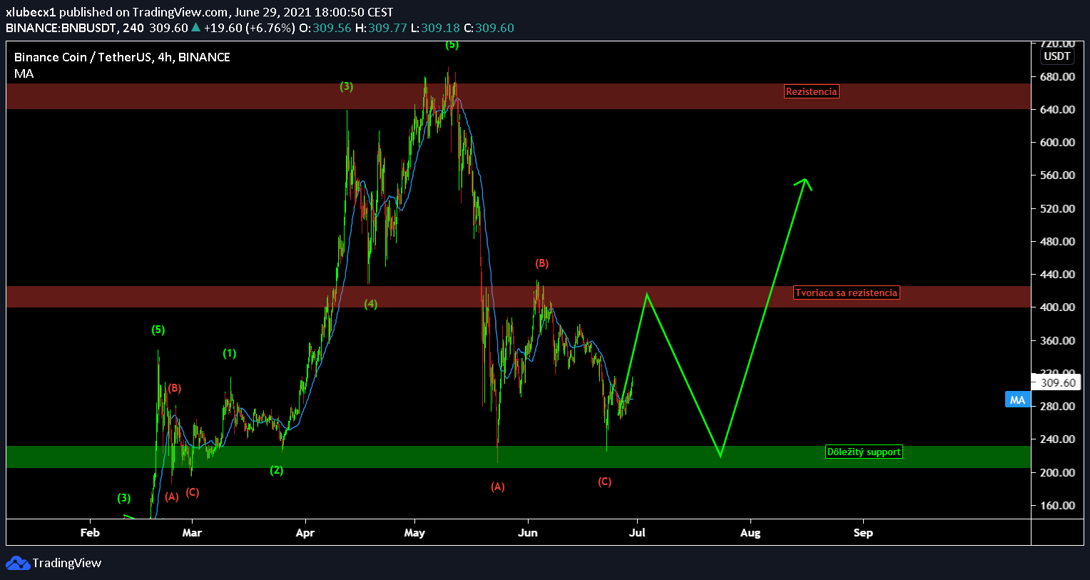 Podobne aj BNB má našliapnuté k rezistencii. Po poklese na 200 USD sme mohli vidieť krátku reakciu a po niekoľkýkrát sa nám potvrdilo, že smerom dole to nepôjde. Musí prísť odraz! Aktuálne rovnako z krátkodobého trendu po takto silnom odraze chceme skôr hľadať long príležitosť ako na short. Na rezistencii okolo 400 USD by som vyberal prvé zisky.