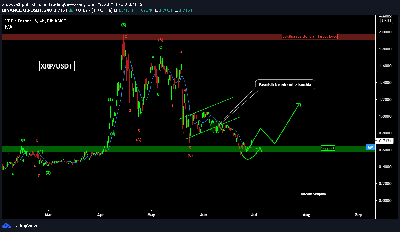 XRP po odraze od supportu na 0,6 USD postupne začína rásť a na grafe môžeme po dlhšej dobe vidieť nájdenie nového high. Predpokladám, že práve aktuálne najsilnejší support z hladiny 0,6, ktorý je niekoľkokrát otestovaný z minulosti, by už nemal byť zlomený. Nechcem vylučovať prípadný re-test tejto hladiny. Avšak pokles pod tento support je málo pravdepodobný. XRP by teraz po odraze malo smerovať na približne 1,1 dolárovú rezistenciu. Práve tu, na 50 % zisku budeme vyberať targety.