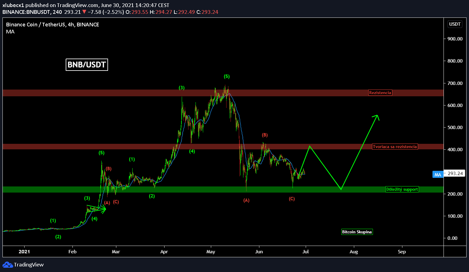 Binance coin po odraze od zóny 200 USD, kde narazil na silný support, naďalej pokračuje v sideways kanáli. Aktuálne môžeme očakávať návrat na 400 USD, kde budeme vyberať targety. Nie je vylúčené, že bullish trend bude pokračovať aj dlhodobo. Avšak najprv musí BNB zlomiť rezistenciu na 400 USD. Potom by už altcoinu BNB nemalo nič brániť v ceste na nové ATH.