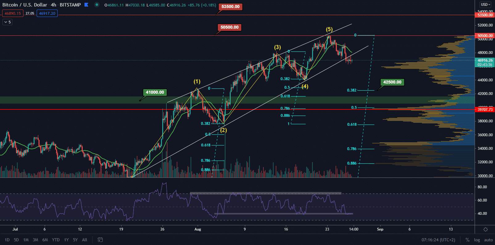 V prípade, že cena bude pokračovať v korekcii, budeme sledovať prvý support na hladine 46 000 $. Tento support však nie je dlhodobo významný. Zaujímavejšie je na tom hladina supportu od 41 000 $ do 42 500 $. Na hodnote 42 500 $ sa nachádza aj prvý target celého rastúceho klínu 38,2 % retracementu. Práve táto zóna je kľúčovou nákupnou a supportnou oblasťou.