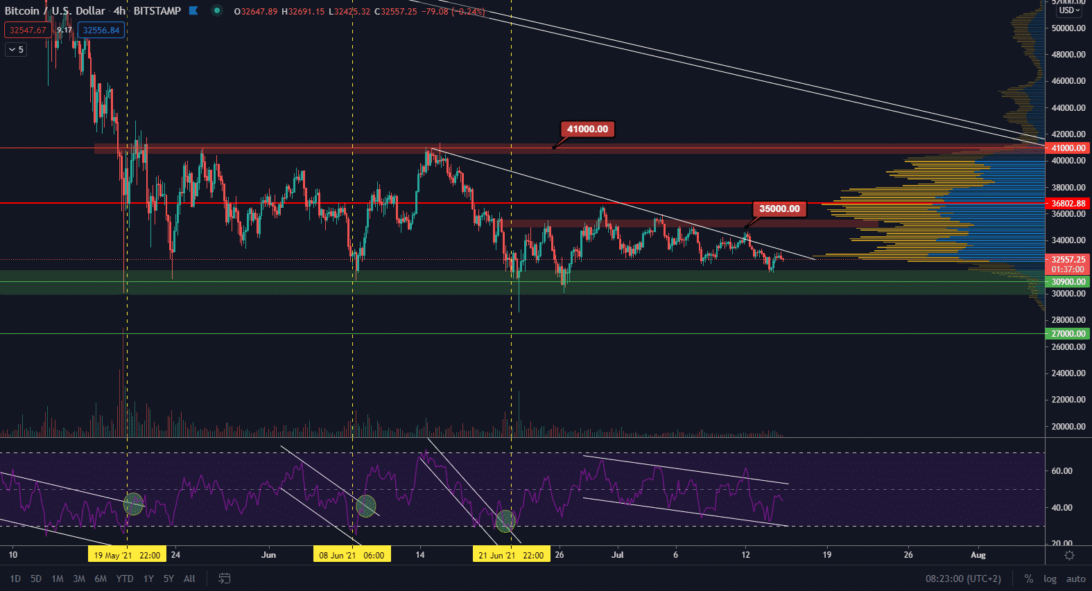 Zdá sa, že z krátkodobého hľadiska teda pôjdeme znovu testovať 31 000$. Rezistenciu z lokálnych maxím triangla stále rešpektujeme a RSI taktiež ukazuje, že je priestor ešte na ďalšiu vlnu smerom nadol. Dôležité však bude vytvoriť minimum v supportnom pásme 31 000$. Predpokladám tak, že RSI znovu spadne na hladinu posledného minima a vytvorí sa pozitívna divergencia ako v predošlých prípadoch.