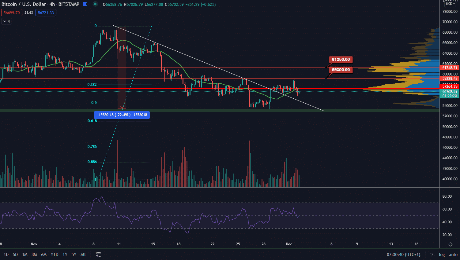 Otestovanie predošlého maxima je vždy bullish signál, no odraz musí byť sprevádzaný vyššími objemami. Z krátkodobého hľadiska teda cena pokračuje sideway a buď musí dosiahnuť vyššie minimum, alebo prekonať rezistenciu na hladine 59 300 $ s býčím targetom na 61 250 $.