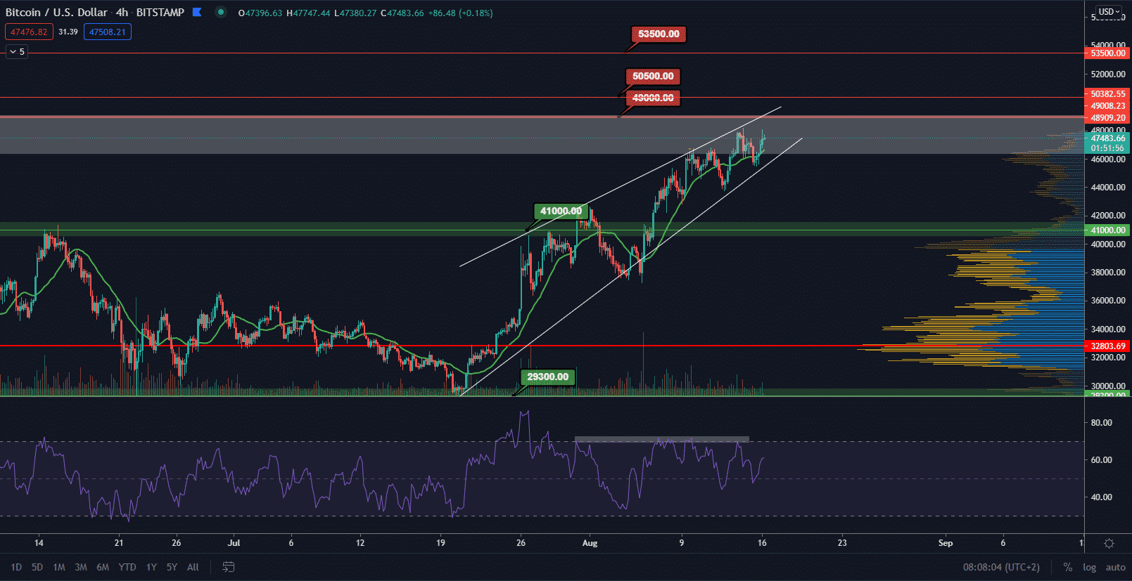 Klín by mal byť uzavretý korekčným legom, avšak nemusí to vždy platiť. Ak sa cene podarí prekonať posledné maximum, ale navyše sa zdvihnú aj objemy, tak je možný aj scenár, kde bude pokračovať po klíne rast. Najbližšie býčie targety sa nachádzajú na hladine 50 500 $ a 53 500 $. Medzi týmito hodnotami sa nachádza hlboký gap s malým počtom transakcií.
