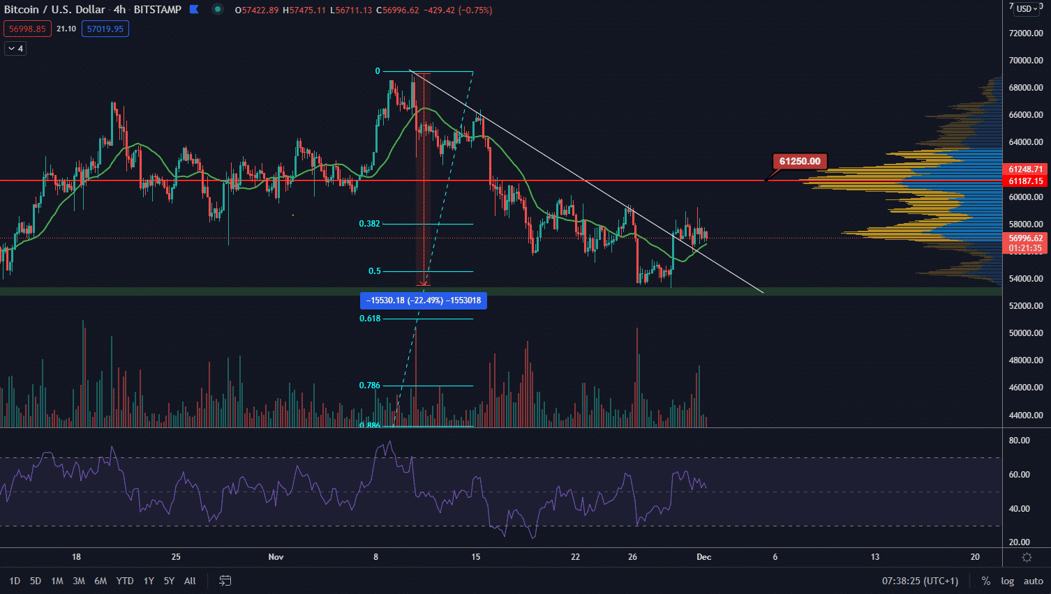 V medveďom scenári je dôležité sledovať pozíciu ďalšieho lokálneho minima. To potrebuje byť vyššie ako to predošlé na hladine 53 300 $. Stále platí, že najbližšia silná supportná zóna sa nachádza v intervale cca 51 000 $ až 53 000 $. Súčasná korekcia predstavuje iba 22,50 %.