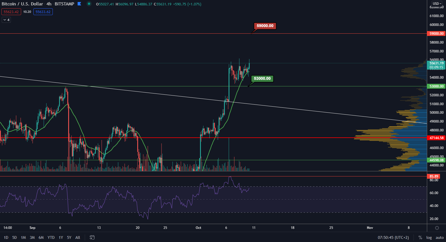 Prerazenie nad 55 000 $ znamenalo počiatok a potvrdenie nového bullrunu. Trhová cena 55 633 $ znamená, že cena je stále na štarte tohto bullrunu. Podľa Stock-to-flow by sa mala cena uzavrieť minimálne na close cene 63 000 $ v októbrovej sviečke.